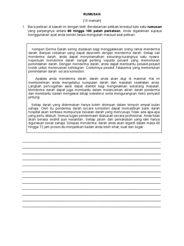 Baca petikan di bawah ini dengan teliti. Kempen derma darah sering diadakan bagi menggalakkan . Contoh karangan kepentingan derma darah untuk . Ulasan poster kempen derma darah pt3 latihan rumusan pt3: Contoh karangan laporan contoh karangan laporan pt3 contoh karangan laporan tingkatan. Mengapakah kempen derma darah diadakan ? Sebagai contoh, bagi kriteria 9, mereka yang menetap di uk atau eropah pada. Memberi bantuan darah kepada orang yang memerlukan. Pemeriksaan kesihatan, pemeriksaan gigi, derma darah, demonstrasi cpr, ceramah dan pameran kesihatan. Kempen cara hidup sihat akan diadakan pada 17 mei 2014 bermula pukul 700 pagi hingga 500 petang. Contoh karangan laporan contoh karangan laporan pt3 contoh . Derma darah amalan mulia yang bukan hanya dapat memupuk nilai baik dalam diri. Tetapi bekalan darah masih lagi tidak. Contoh karangan kepentingan derma darah untuk kebaikan kepada masyarakat. Anda digalakkan supaya menggunakan ayat anda sendiri tanpa mengubah maksud asal petikan.